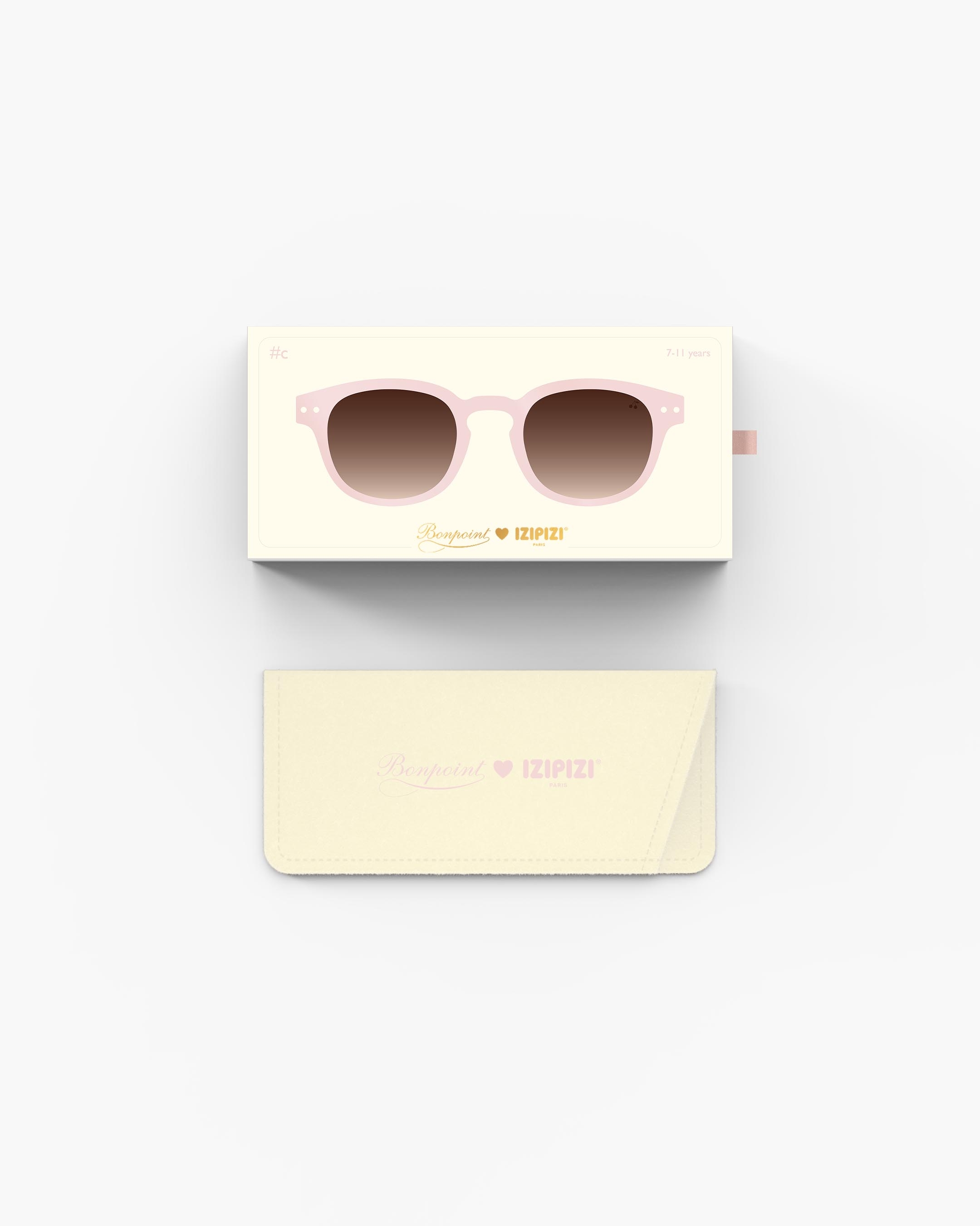 Las gafas de sol para niños #c Sweet Pink nacen de la colaboración exclusiva con Maison Bonpoint. Diseñada para niños de 7 a 11 años, esta montura pantos en un rosa luminoso destaca por su acabado brillante y sus lentes degradadas marrones. Un modelo chic y ligero, ideal para acompañar a los más grandes con elegancia.