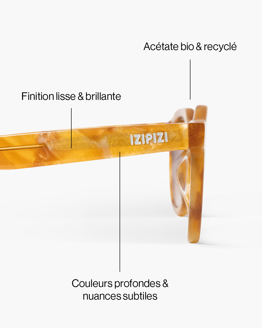Une nouveauté premium signée IZIPIZI. Ces lunettes de soleil #ECHO sont composées d'acétate biosourcé et recyclé, un matériau noble aux reflets profonds et au toucher soyeux. Design intemporel, confort durable, allure affirmée : cette capsule incarne un nouveau chapitre. Caramel Pearl est un coloris caramel chaud et lumineux, sublimé par de délicats reflets scintillants qui captent la lumière comme de fines perles.